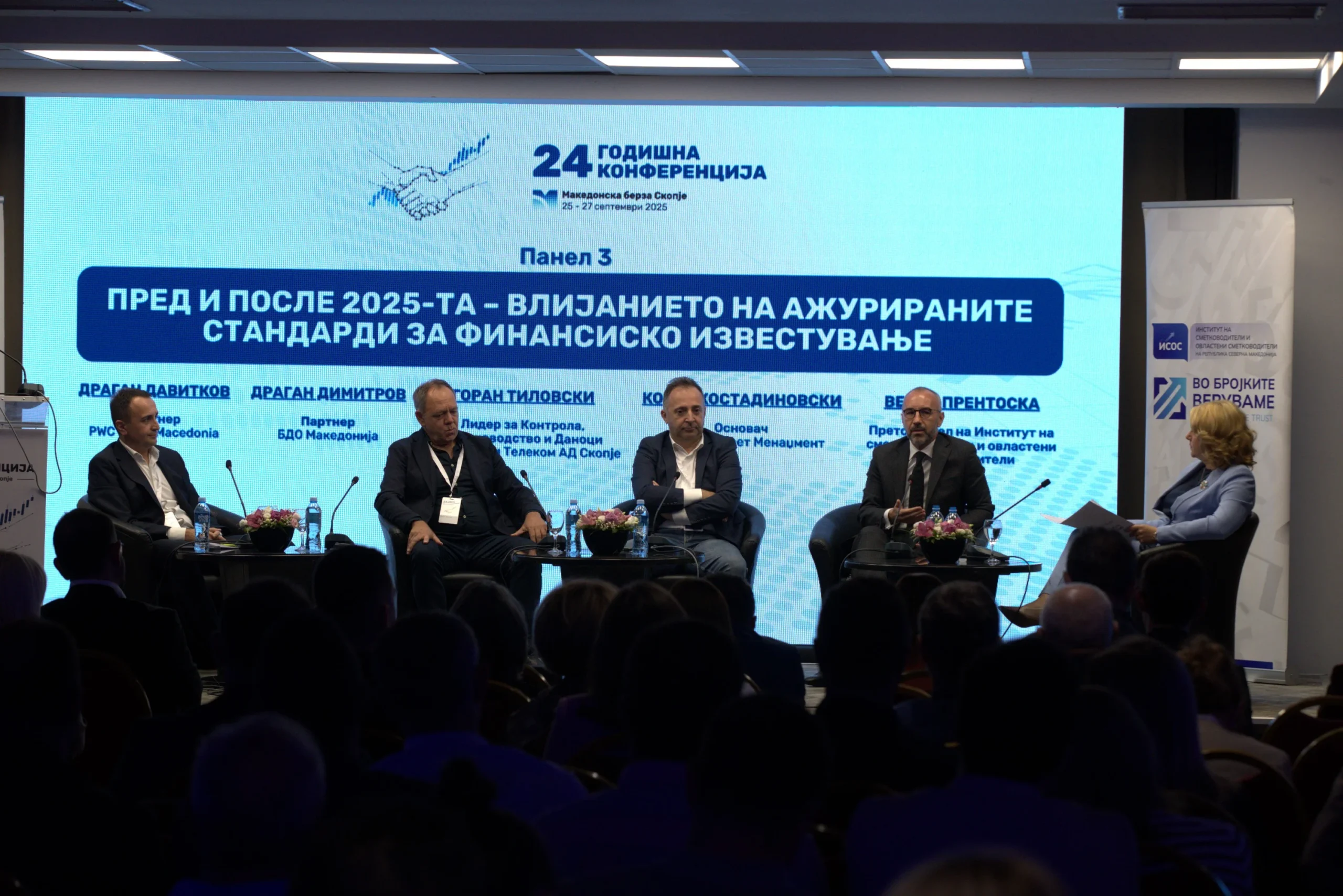 Во рамките на Меморандумот за соработка со Македонска берза, Институтот на сметководители и овластени сметководители (ИСОС) учествуваше во реализацијата на панелдискусијата на тема: „Пред и после 2025-та – влијанието на ажурираните стандарди за финансиско известување и ревизија“, што се одржа во склоп на 24-тата годишна конференција на Македонска берза.